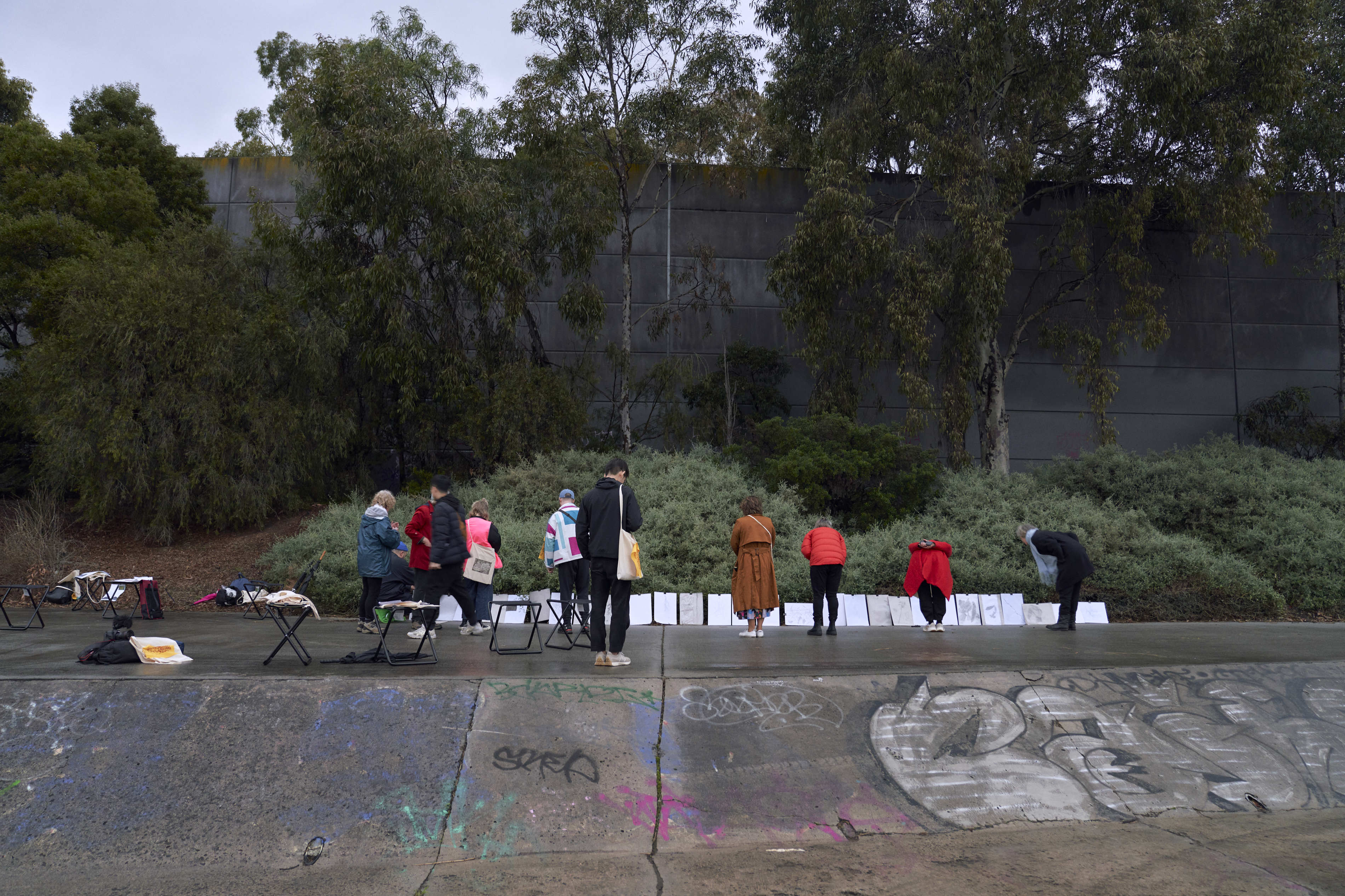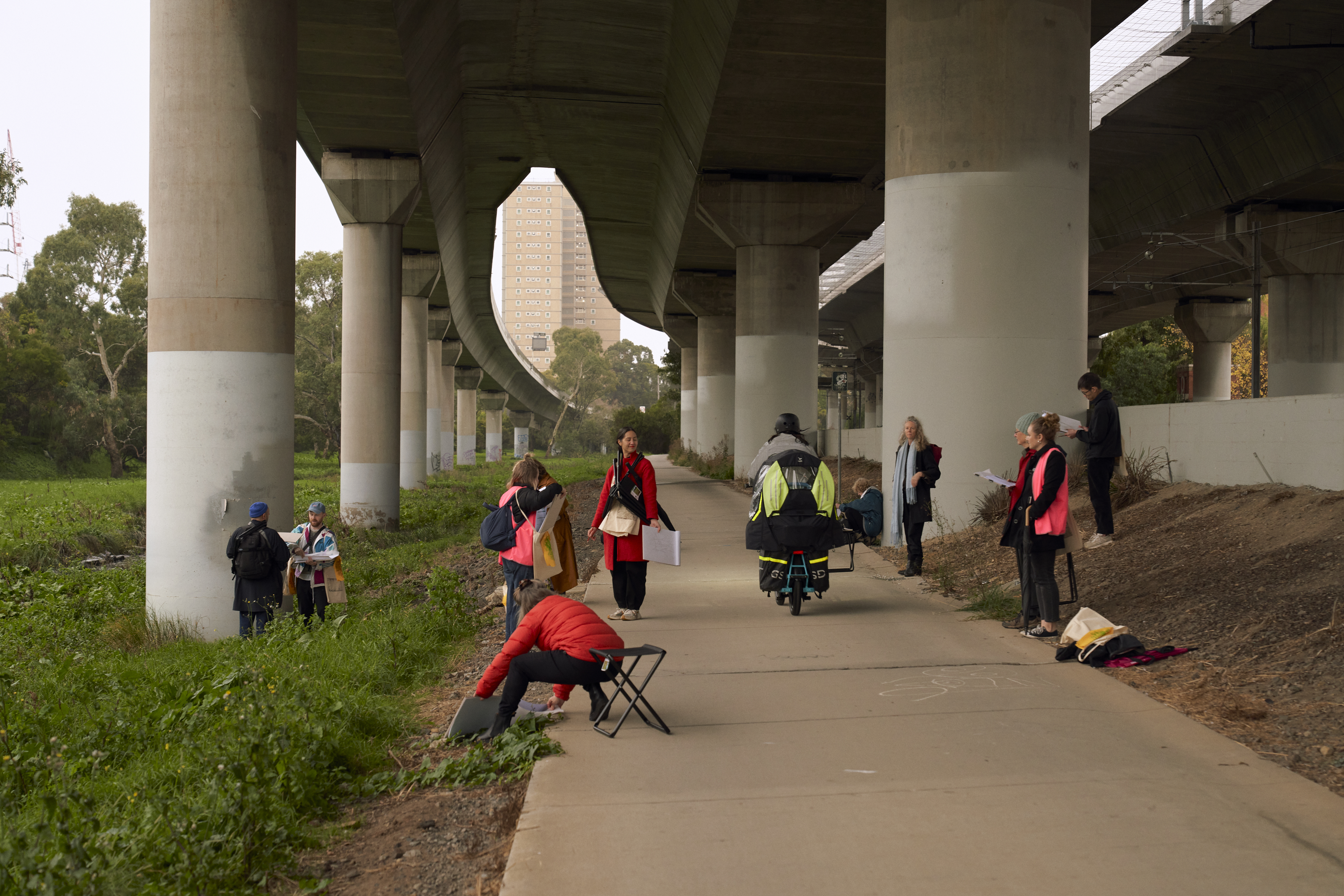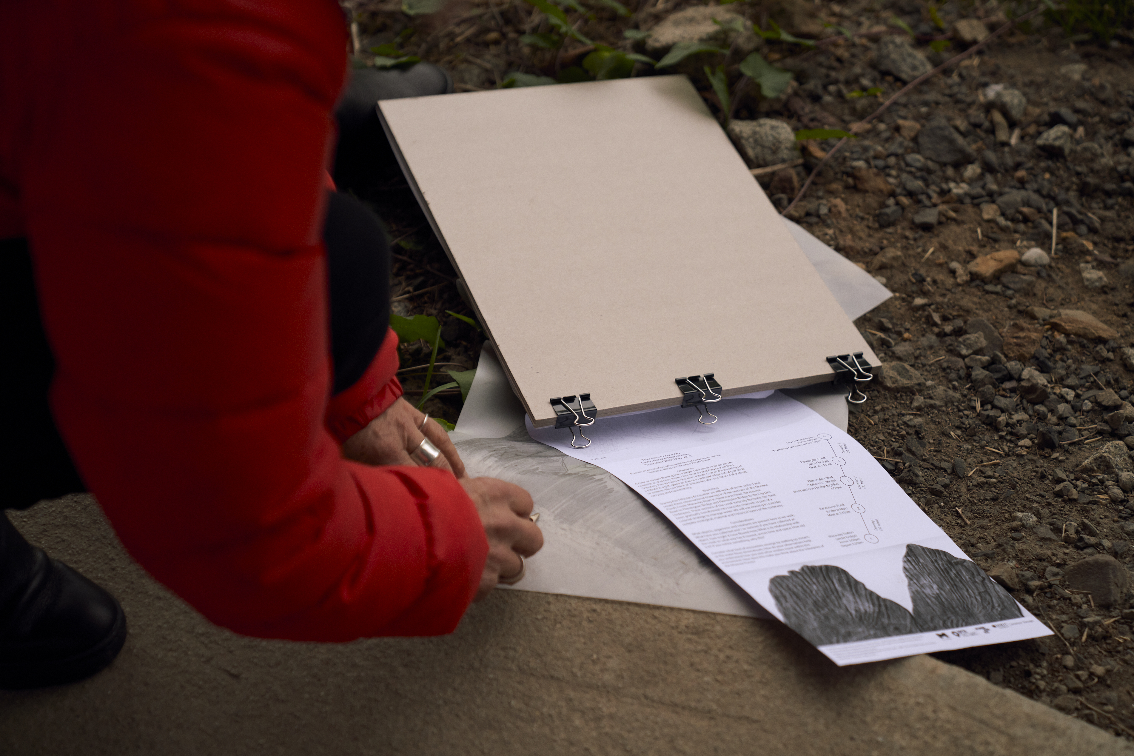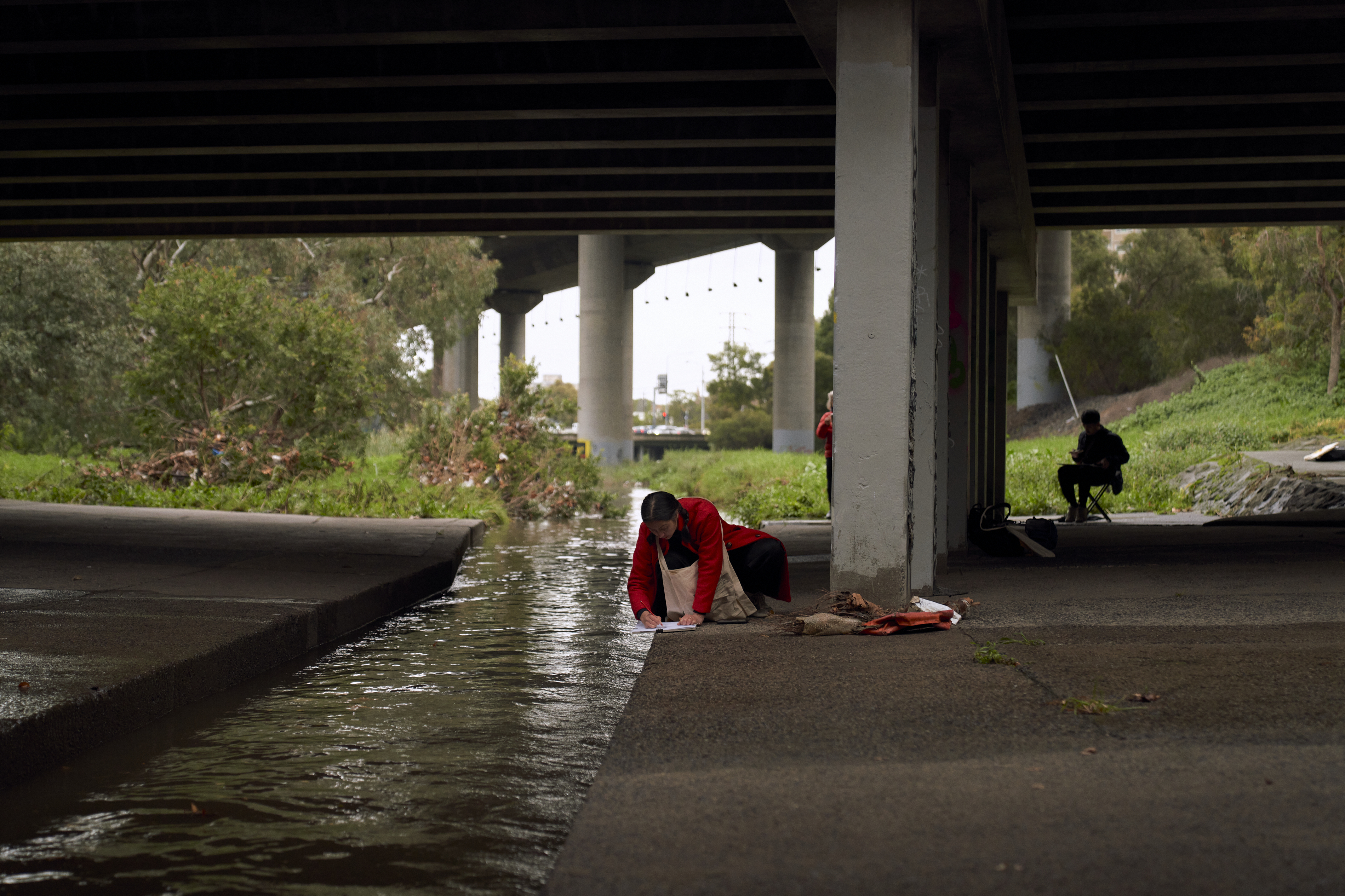 Pauses during the walk reveal water seeping, gurgling, rippling and overlapping beyond the channelised segment of the Moonee Ponds Creek. Rainy weather in the floodplain amplifies the movement of water along concrete drains, with a rush of objects and organisms flowing and pooling. This 2 hour walk and drawing workshop, culminates in a gathering of mark making that prompts a collective reimagining of past and present ecologies and waterways.